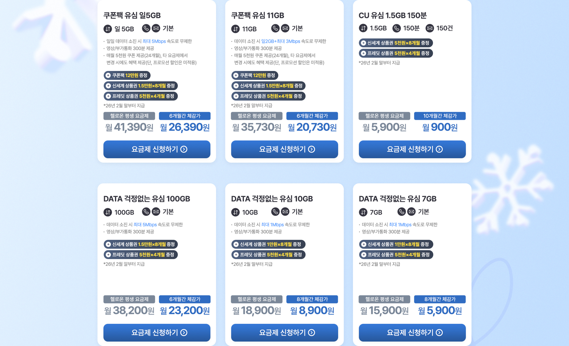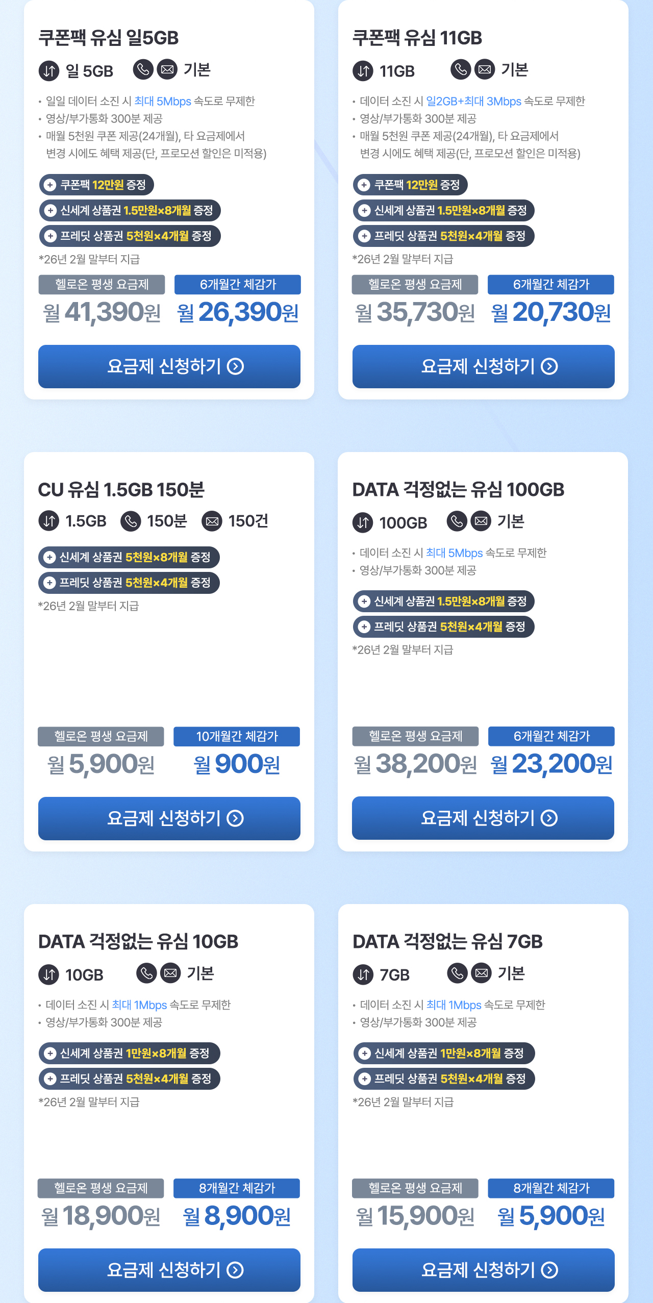 - 기존 타 요금제 이용고객의 경우 쿠폰팩 요금제로 변경 가능하나, 고객센터를 통해서만 변경이 가능하며, 프로모션 할인 전 기본 요금으로만 이용 가능합니다.(쿠폰팩 혜택 제공)